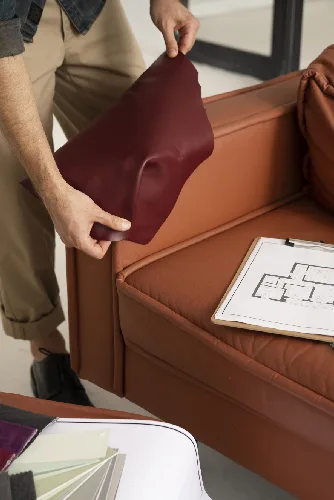 Choose from a wide selection of premium upholstery fabrics, genuine and faux leathers, durable wood types, custom finishes, high-density foams, and eco-friendly materials to match your aesthetic and comfort needs.